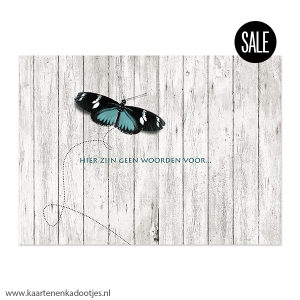 Dubbele kaart met een print van lichte houten planken, vlinder en de tekst ‘hier zijn geen woorden voor…’. Het ontwerp loopt door op de achterkant.