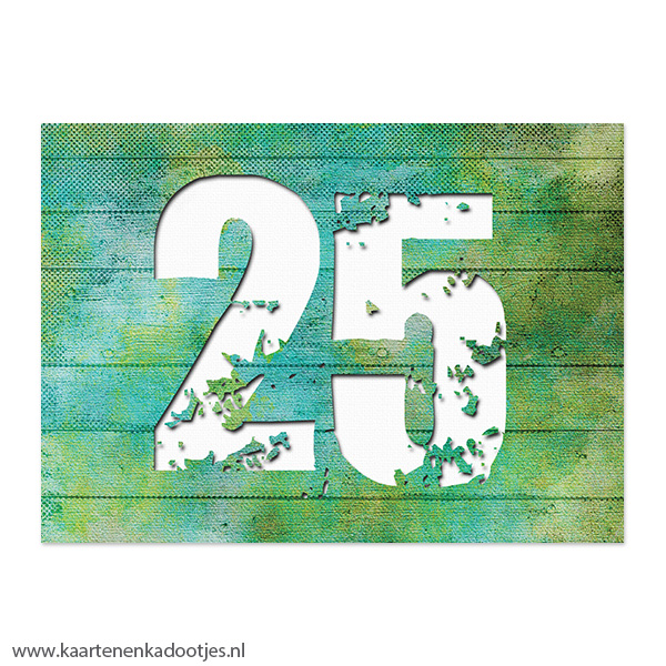 Kaart met het cijfer 25. Vanwege het neutrale karakter kan hij gebruikt worden als uitnodiging of als felicitatiekaart voor een zilveren bruiloft, 25-jarig jubileum en verjaardag.