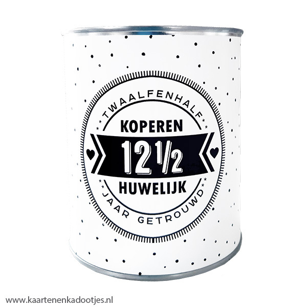 Ken jij een stel dat 12½ jaar getrouwd is? Dan is dit kadoblik een superleuk en origineel kado. Je kunt het blik zelf vullen met chocola, snoep, giftcard, geld en/of een klein kadootje.