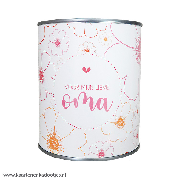 Dit kadoblik is een superleuk en origineel kado voor oma’s. Je kunt het blik zelf vullen met chocola, snoep, knutselwerkje en/of een klein kadootje.