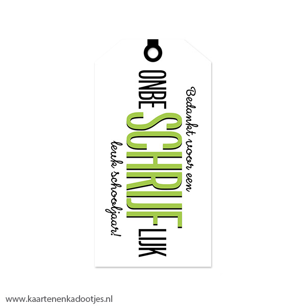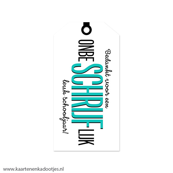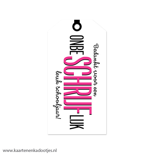 Deze kadolabels maken een kadootje voor de juf of meester echt helemaal af! Met de tekst ‘Bedankt voor een onbeSCHRIJFlijk leuk schooljaar!’ passen ze perfect bij onze leuke notitieboekjes en pennen. Alhoewel de voorkant een glossy finish heeft zijn deze labels aan beide kanten beschrijfbaar met een normale pen of stift. Zet het koordje vast met een mooie sticker of stukje washi tape voor een extra leuk effect.